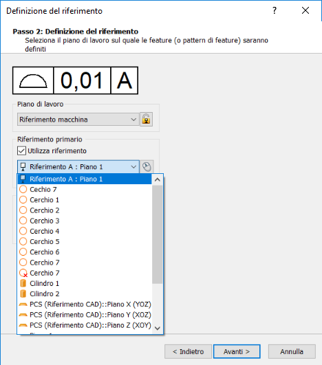 - È possibile specificare e modificare gli elementi di riferimento usati in diverse misurazioni GD&T modificando la feature di riferimento utilizzata nell'elemento Riferimento GD&T.