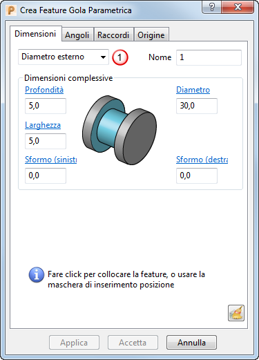 Reimposta — Fare clic su questa opzione per reimpostare i parametri di creazione della feature ai valori di default.