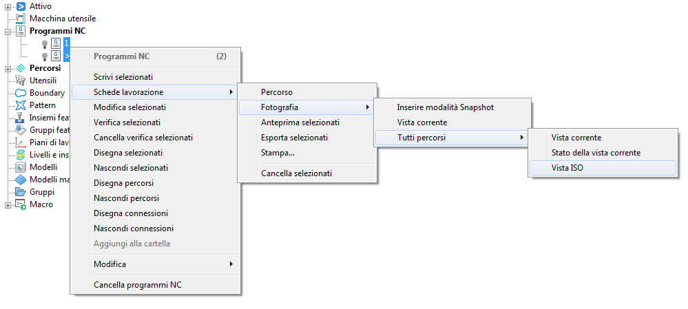 - Nell'Explorer, selezionare tutti i nomi richiesti del programma NC, e dal menu contestuale selezionare Schede di lavorazione > Fotografia > Tutti percorsi > Vista ISO.