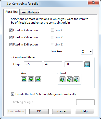 Fissa in direzione X - Vincolare l'elemento in modo che sia di dimensioni fisse nella direzione X rispetto al piano di lavoro di vincolo.