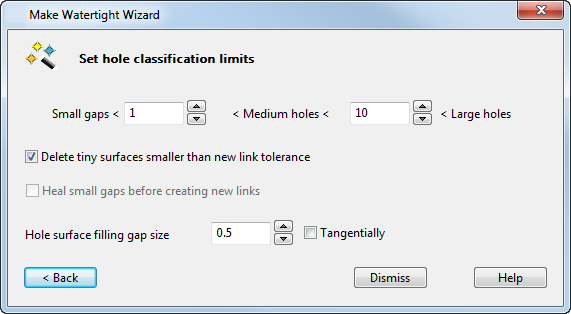 Elimina superfici di piccole dimensioni, più piccole della nuova tolleranza di collegamento - Deselezionare questa opzione per limitare la tolleranza di collegamento massima alle dimensioni più piccole. Selezionare questa opzione per limitare la tolleranza di collegamento massima alle dimensioni del gap piccolo più grandi.