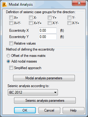 There are also two buttons for opening additional dialogs. In these, parameters of the modal analysis and selected seismic code can be specified. In the modal and seismic analysis parameters the definition of a mass eccentricity should not be set because it will automatically set during the generation of cases.