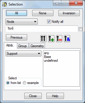 A checkbox for determining the definition of selection mode is found to the right of the list of selected nodes. If deselected, the field of node selection will display node numbers corresponding to the nodes where the support is applied.