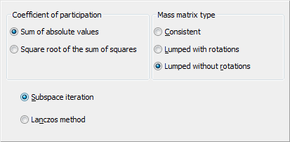 Note: You cannot use Lanczos' method for structures that are separated (Lanczos' method requires a lumped T tridiagonal matrix, while a separated structure - a consistent T matrix). To use Lanczos' method, you must connect structures that are separated in such as way as not to change the structure model. For example, you can add a bar among the supports. If Lanczos' method is selected, calculations are performed using the subspace iteration method.