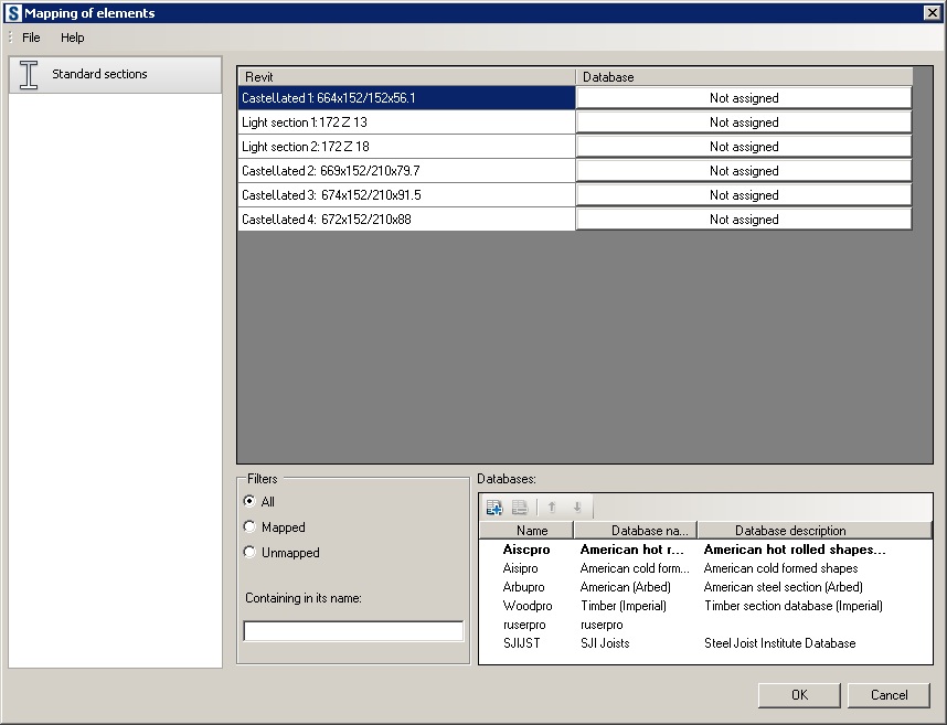 - La finestra di dialogo Assegnazione di elementi si apre solo se, durante il trasferimento, i nomi di profilati (definiti in Revit) non vengono riconosciuti nel database dei profilati attivi di Robot.