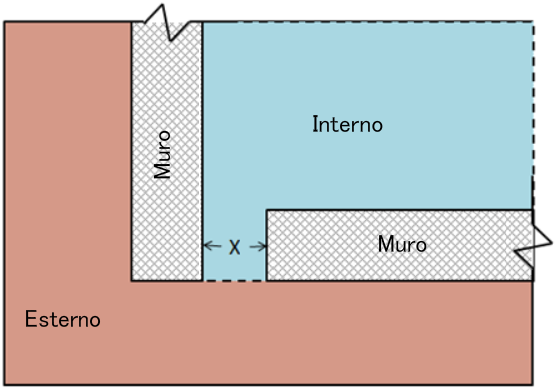 Questo concetto può essere illustrato come segue, ovvero mostrando la vista della pianta di due muri di delimitazione di un vano interno con uno spazio tra di essi di X dimensioni.