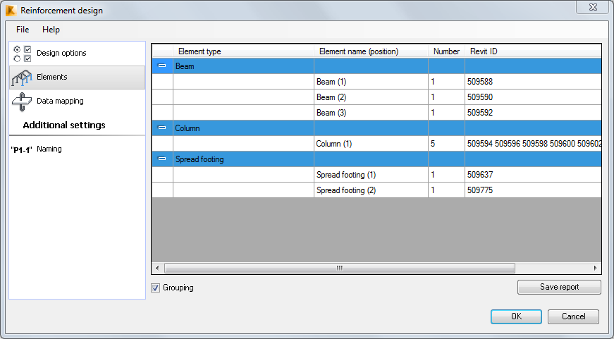 Fare clic su Salva rapporto per salvare il contenuto della scheda Elementi. Elenca gli elementi di Revit (ID di Revit) e indica le posizioni a cui sono assegnati. È utile quando si desidera tornare agli elementi di Revit con armatura progettata o verificata in Robot.