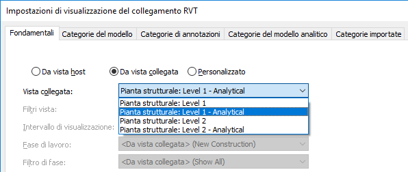 - Nella finestra di dialogo Impostazioni di visualizzazione del collegamento RVT, nella scheda Fondamentali, effettuare le seguenti operazioni: