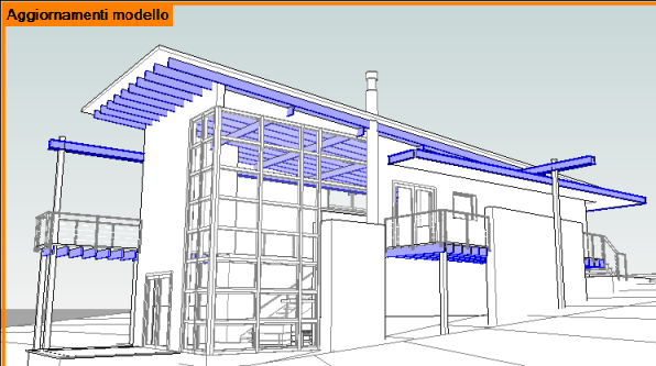 Nell'esempio riportato di seguito, la vista mostra gli elementi del modello che devono essere sincronizzati con il modello centrale. Le viste con modalità di visualizzazione di condivisione del lavoro attivata presentano un bordo colorato e il nome della modalità di visualizzazione applicata (Aggiornamenti modelli), come mostrato nell'esempio. È possibile disattivare o modificare la modalità di visualizzazione in qualsiasi momento.