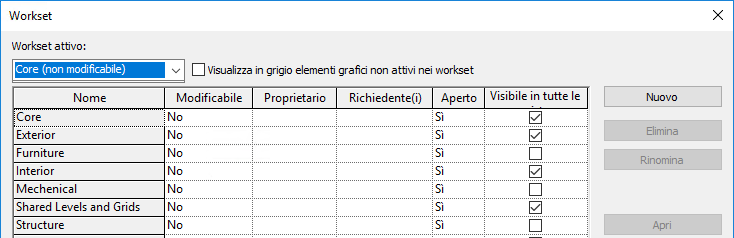 Questa impostazione globale definisce il comportamento di default di ciascun workset nelle viste di progetto. È possibile modificare la visibilità di un workset in una o più viste specifiche.