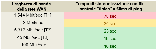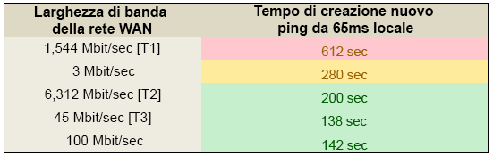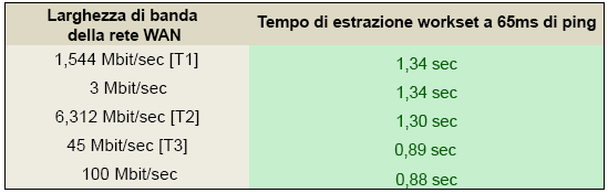 • I test di operazioni con condivisione del lavoro vengono eseguiti su reti geografiche (WAN) da 65 ms anziché da 35 ms.