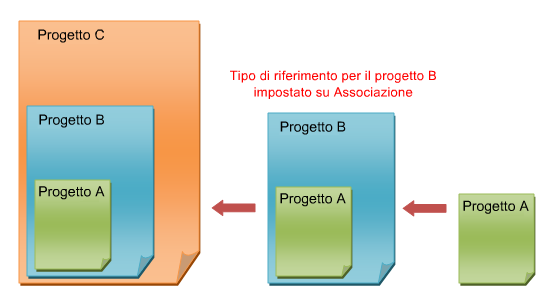Se si sostituisce l'impostazione Tipo di riferimento del Progetto A con Associazione all'interno del modello principale (Progetto B), quando quest'ultimo viene importato nel Progetto C, il collegamento nidificato (Progetto A) viene visualizzato.