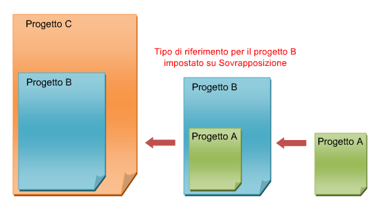 Nella seguente immagine, il Progetto A è collegato al Progetto B, pertanto il Progetto B è il modello principale. L'opzione Tipo di riferimento del Progetto A è impostata su Sovrapposizione all'interno del relativo modello principale (Progetto B). Quando si importa il Progetto B nel Progetto C, il Progetto A non viene visualizzato.
