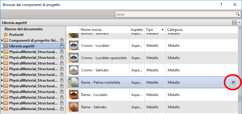 È possibile sostituire un componente esistente con un altro selezionato nel Browser dei componenti di progetto. Il materiale acquisisce le proprietà del nuovo componente di progetto.