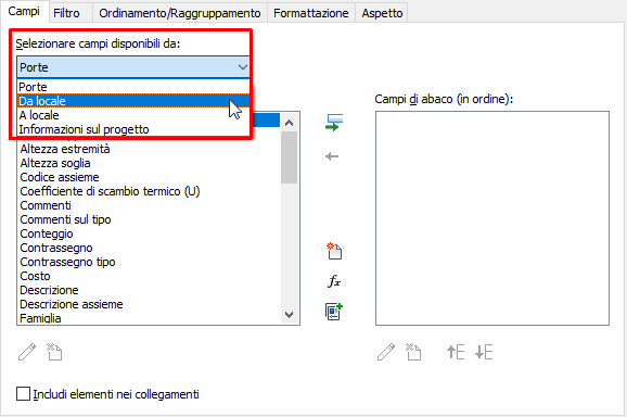 - Nella scheda Campi, dal menu a discesa Selezionare campi disponibili da, scegliere Da locale o A locale.