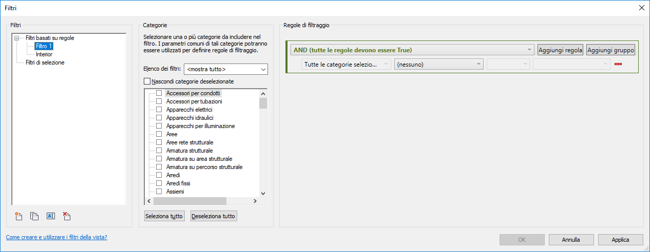 Dopo aver creato il filtro, applicarlo ad una o più viste per cambiare la visibilità e la visualizzazione grafica degli elementi identificati dal filtro.