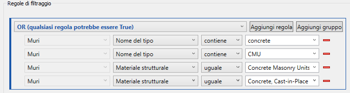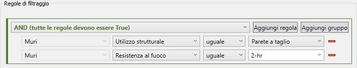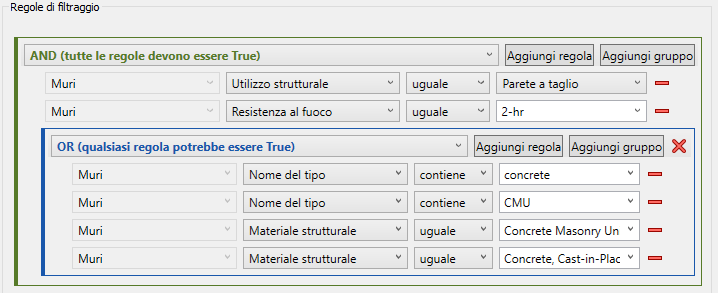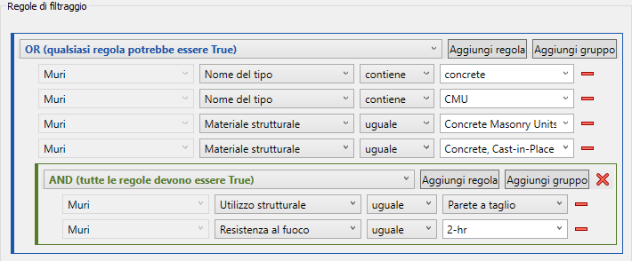 In questo caso, per identificare tutte le pareti a taglio nel modello che sono fatte di calcestruzzo e che presentano una resistenza al fuoco di 2 ore, è necessario iniziare con il gruppo di regole AND e nidificare un gruppo di regole OR all'interno di esso, come indicato di seguito: