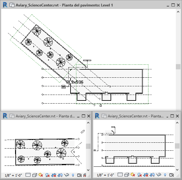 Nella parte superiore dell'illustrazione seguente vengono visualizzati i riquadri di definizione che circondano l'edificio principale e l'aviario. Il riquadro di definizione 1 è stato applicato alle linee di griglia dell'edificio principale, mentre il riquadro di definizione 2 è stato applicato alle linee di griglia dell'aviario. Di conseguenza, nelle viste dipendenti (parte inferiore dell'illustrazione) vengono visualizzate solo le linee di griglia appartenenti a ciascuna parte dell'edificio.