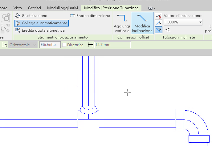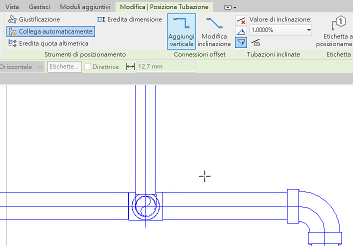 - Per eseguire la connessione diretta indipendentemente dal valore di inclinazione, nella barra multifunzione fare clic sulla scheda Modifica | Posiziona Tubazione