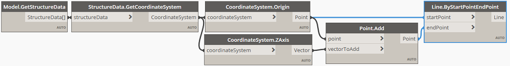 Nota: Un modo semplice per identificare correttamente l'asse dell'elemento del telaio è utilizzare il nodo StructureData.GetCoordinateSystem, che offre un oggetto CoordinateSystem in Dynamo. Quindi, è possibile visualizzare l'asse di interesse (ad esempio, l'asse Z) creando una linea (Line.ByStartPointEndPoint) dall'asse di origine (CoordinateSystem.Origin) al vettore dell'asse Z (CoordinateSystem.ZAxis, Point.Add to the Origin):