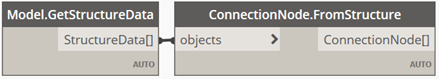 Il primo nodo di Dynamo in uno script di Connessioni in acciaio per Dynamo è Model.GetStructureData. Il nodo non presenta input. L'output del nodo di Dynamo è un elenco di elementi dei dati della struttura (travi e pilastri), determinato in base alla selezione corrente. In questo esempio, l'output è: [B1, B2, B3, B4].