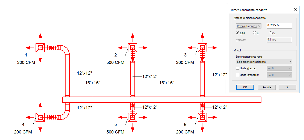 Le immagini seguenti mostrano i risultati dei vari metodi di dimensionamento dei condotti.