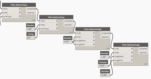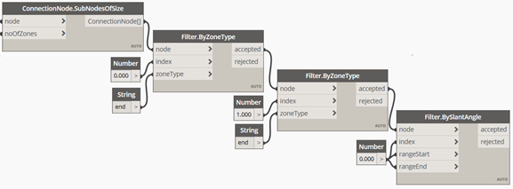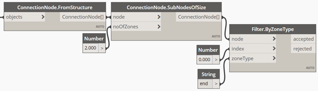 Il nodo di Dynamo successivo da aggiungere allo script è Filter.ByZoneType. Questo nodo utilizza come input un nodo di connessione (o un elenco di nodi di connessione), un indice corrispondente all'elemento dei dati della struttura nel nodo di connessione e un tipo di zona, che può essere estremità o corpo (attualmente specificato come stringa senza distinzione tra maiuscole e minuscole). Come output, il nodo di Dynamo mostra i nodi di connessione che soddisfano i criteri e quelli che non li soddisfano.