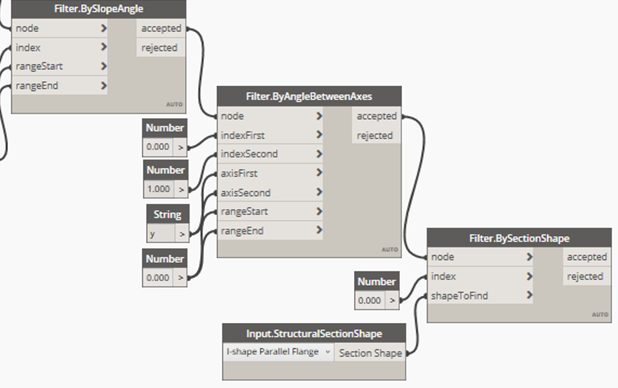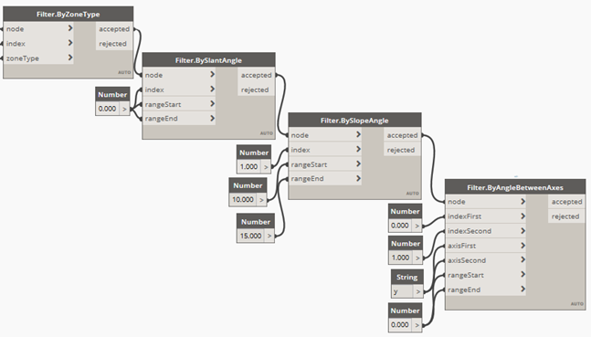 Aggiungere il nodo di Dynamo Filter.ByAngleBetweenAxes. Il nodo utilizza come input un nodo di connessione o un elenco di nodi di connessione, gli indici degli elementi strutturali del nodo di connessione da verificare, i due assi da verificare (X, Y o Z), l'inizio e la fine dell'intervallo dell'angolo di inclinazione (0-90°), in gradi.