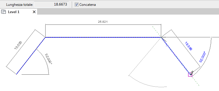 • Specificare il primo punto, spostare il cursore nella direzione in cui si intende estendere la linea e immettere il valore per la lunghezza della linea, ripetendo la procedura per ogni linea della catena.