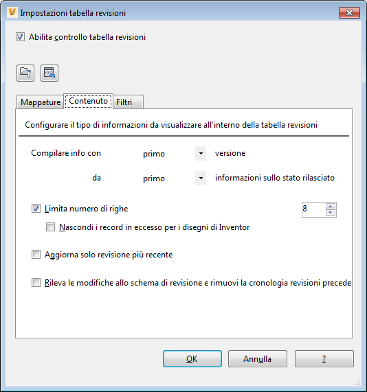 Quando si lavora con le revisioni, potrebbero presentarsi in una revisione diverse versioni di un disegno. È possibile determinare se visualizzare la prima versione della revisione o l'ultima versione dei dati della revisione nella tabella revisioni, dalla scheda Contenuto.