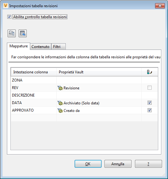 Nella scheda Mappatura, è possibile associare le proprietà del Vault alle colonne della tabella revisioni. ![]() |