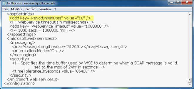 - Modificare la linea riportante <add key="PeriodInMinutes value="10"/> con l'intervallo desiderato. Il tempo può essere impostato ad un valore frazionario, ad esempio 0,1 per 6 secondi o 1,5 per 90 secondi.