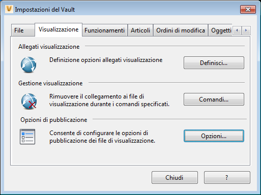 Nella finestra di dialogo Impostazioni del Vault, scheda Visualizzazione, è possibile configurare gli allegati di visualizzazione, la gestione dei file di visualizzazione e le impostazioni di pubblicazione.