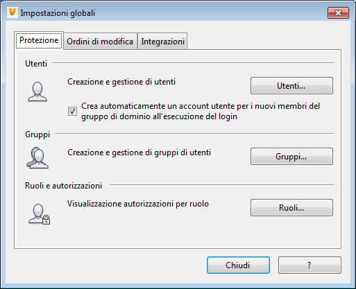 Nella scheda Protezione sono disponibili le opzioni che consentono di concedere l'accesso utente al Vault e di assegnare le autorizzazioni utente. È possibile inoltre creare gruppi di utenti nonché assegnare privilegi di accesso e ruoli ai gruppi. I ruoli assegnati ad un utente o ad un gruppo definiscono le autorizzazioni dell'utente o dei membri del gruppo.