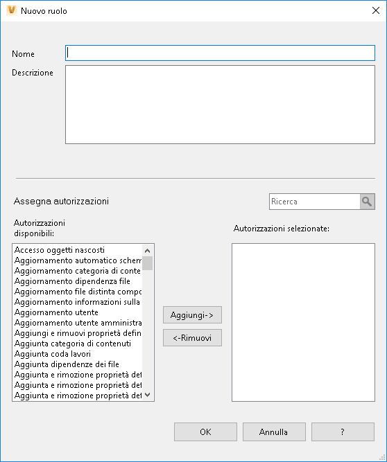 I ruoli vengono creati e amministrati nella finestra di dialogo di gestione dei ruoli. È possibile visualizzare le autorizzazioni assegnate ad un ruolo quando si crea, copia o modifica un ruolo.