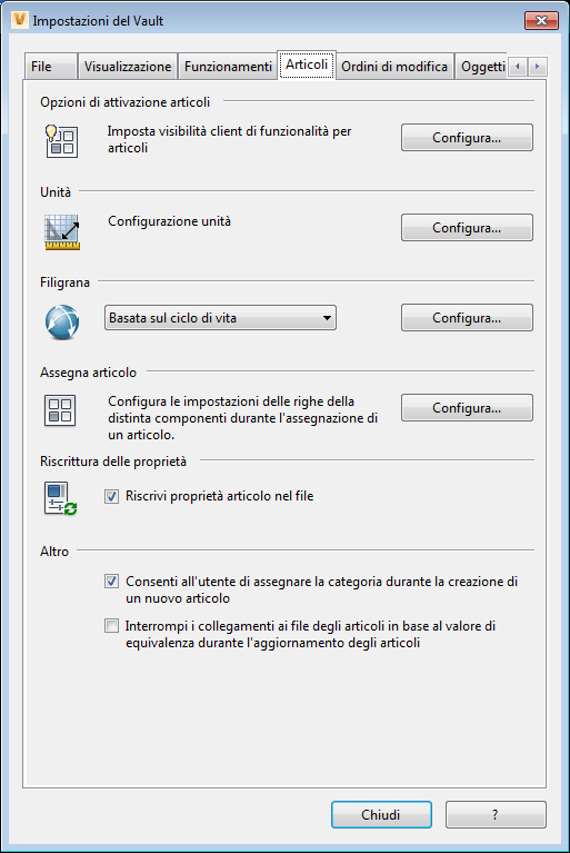 Impostazioni del Vault. La scheda Articoli della finestra di dialogo Impostazioni del Vault contiene le opzioni per configurare le unità di misura, gestire le preferenze di filigrana, configurare le impostazioni delle righe della distinta componenti e consentire agli articoli di riscrivere le proprietà nei file associati. In questa scheda è inoltre possibile disattivare la funzionalità Articoli.