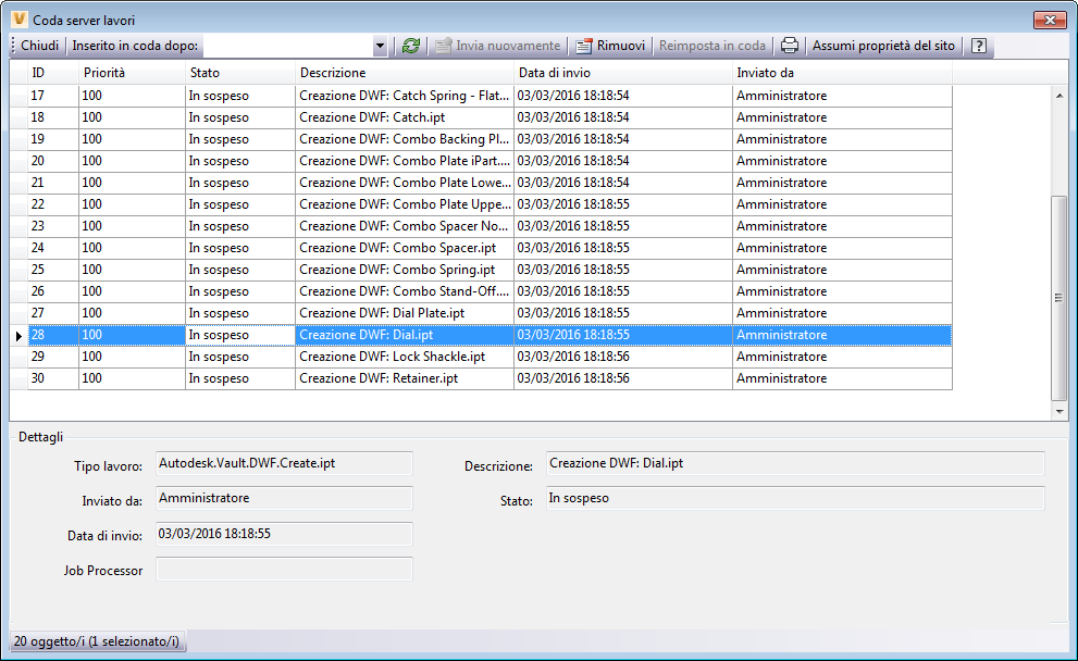 La coda del server lavori consiste di un elenco, o coda, dei lavori inviati dai client (Inventor, AutoCAD, Vault e Autoloader) in attesa di elaborazione. Tale coda viene memorizzata e gestita dal server del Vault.