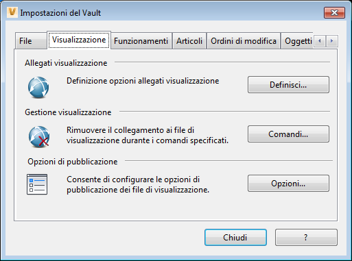 La scheda Visualizzazione nella finestra di dialogo Impostazioni del Vault contiene le opzioni per la configurazione degli allegati di visualizzazione, la gestione dei file di visualizzazione e la configurazione delle impostazioni di pubblicazione.