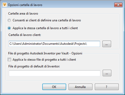 Il file di progetto di default di Autodesk Inventor per Vault può essere specificato da un amministratore.