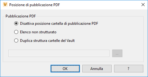 - Disabilita posizione cartella di pubblicazione PDF: disabilita per pubblicare i file PDF localmente. I file PDF generati automaticamente continuano a essere creati nel Vault Client.