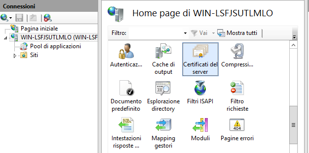 - Selezionare il nodo del server nella vista struttura e fare doppio clic sulla funzione Certificati server nella vista elenco.