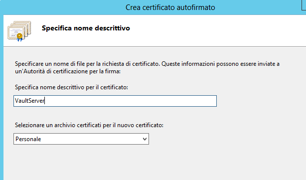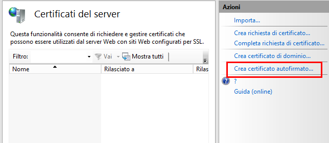 - Fare clic su Crea certificato autofirmato... nel riquadro Azioni.
