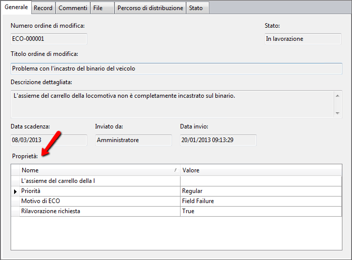 Oltre alle proprietà di default (Numero ordine di modifica, Titolo ordine di modifica, Descrizione e così via) è possibile definire altre proprietà. Un amministratore deve configurare proprietà aggiuntive prima di poterle utilizzare.