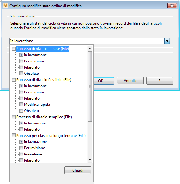 - Selezionare gli stati del ciclo di vita in cui un articolo o un file non devono trovarsi, per consentire all'ordine di modifica di spostarsi dallo stato In lavorazione.