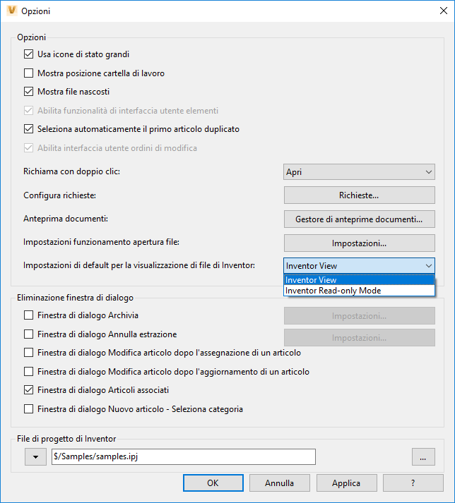 - Impostazioni di default per la visualizzazione di file di Inventor