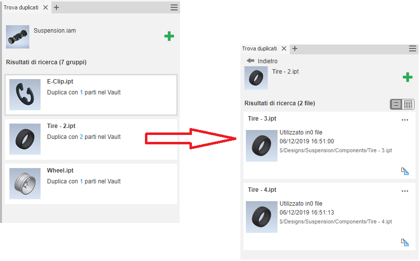 Fare clic sul risultato di gruppo desiderato per visualizzare le singole parti duplicate.