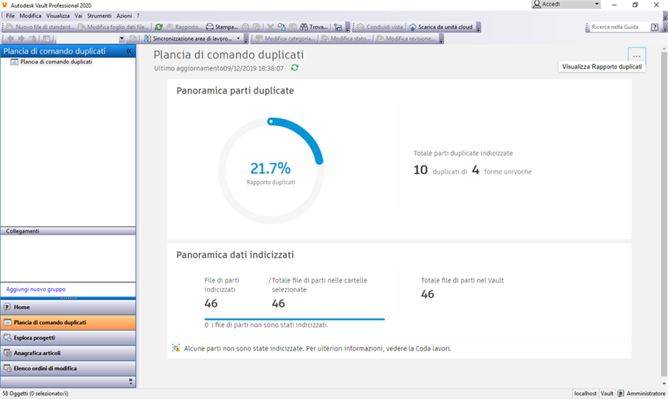 Completata l'indicizzazione dei file, è possibile visualizzare i dati nella Plancia di comando duplicati. In Vault Client, fare clic su Plancia di comando duplicati. È possibile visualizzare il rapporto delle parti duplicate ed esportarlo in formato Excel, PDF o Word.