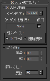 アニメーションの精度を制御するために使います。IK ソリューションのアニメーション表示を粗くしたりジッターさせる場合は、[反復](iterations)の値を増やします。