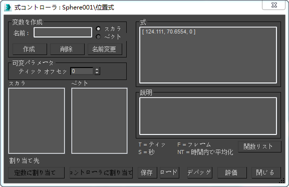このウィンドウには、すべての変数の値のほか、式の評価値が表示されます。ウィンドウの表示内容は、変数値の変更やタイム スライダの移動に伴い自動的に更新されます。したがって、式の効果をインタラクティブに確認することができます。このウィンドウには、フレーム(F)、平均化値(NT)、秒単位の経過時間(S)、およびティック単位の経過時間(T)も表示されます。