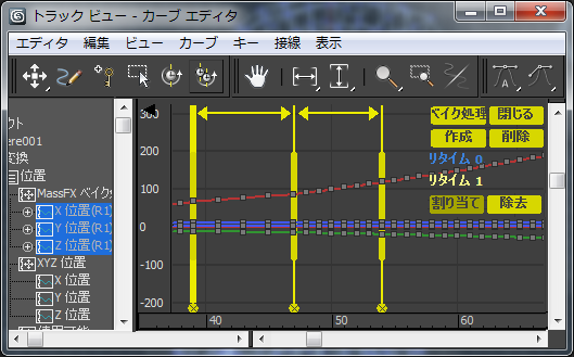 これにより、ハイライト表示されたトラックのアニメーションがリタイマの影響から除外されます。 リタイマは残りますが、オブジェクトの動作の影響は抑止されます。 オブジェクトのカーブがキー ウィンドウから消えて、このリタイマでアニメーションが編集できないことを示します。